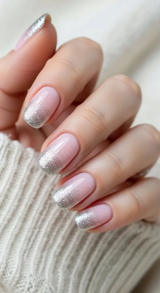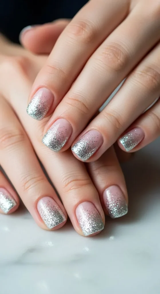 A glitter gradient fades from sparkle to soft color. Start with a nude base. Apply glitter mainly on tips and blend downward. A sponge helps with blending. Short nails keep the gradient subtle. Top coat smooths the surface. This style works for festive days and evenings.