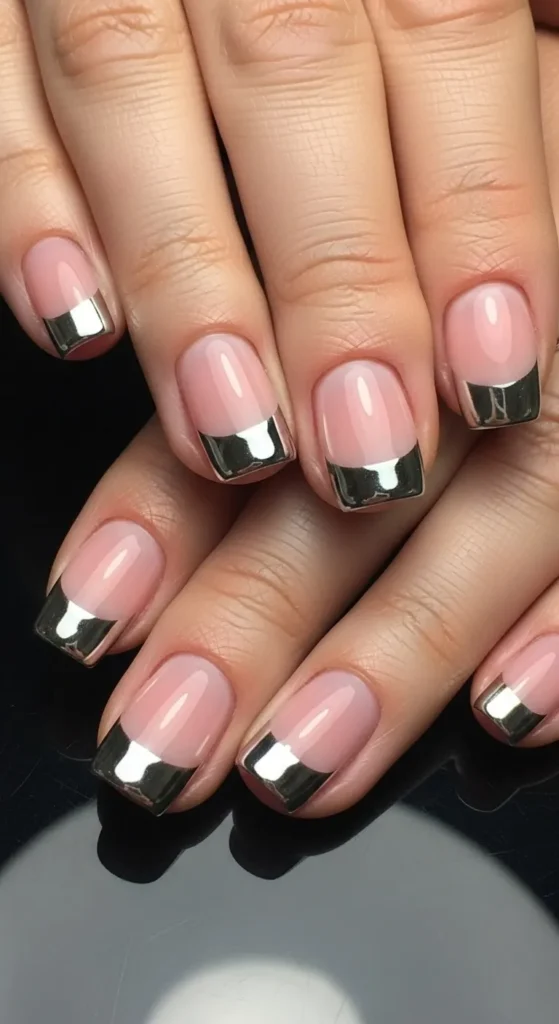 Metallic tips add shine in a simple way. Use silver, gold, or rose gold polish for tips. Apply carefully with a thin brush. Short nails make the look refined. Add top coat for durability. This style suits workdays and events alike.