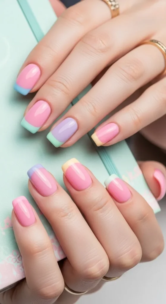 Pastel French tips are perfect for light and cheerful looks. Replace white tips with soft colors like mint, baby blue, or lavender. Apply a nude base first, then paint pastel tips carefully. Short nails keep the colors subtle. You can mix different shades on each nail for fun. Pastel polish is affordable and easy to find. Finish with clear polish for longer wear. This style suits spring, summer, and casual outfits.