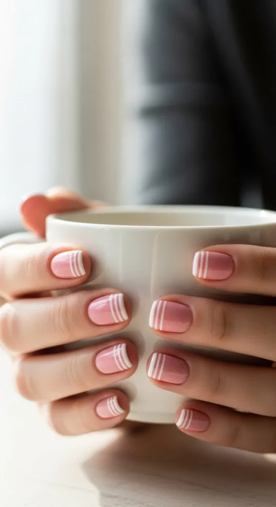 Add thin stripes on the tips using a fine brush. You can place them horizontally or diagonally. Keep lines light and even. Short nails look balanced with stripes. Seal with top coat. This style adds detail without clutter.