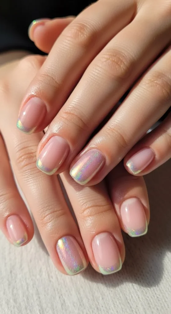 Iridescent polish reflects soft rainbow colors. Apply nude base first. Then paint thin iridescent tips. Short nails keep shimmer gentle. Top coat smooths everything. This style works for day and night looks.