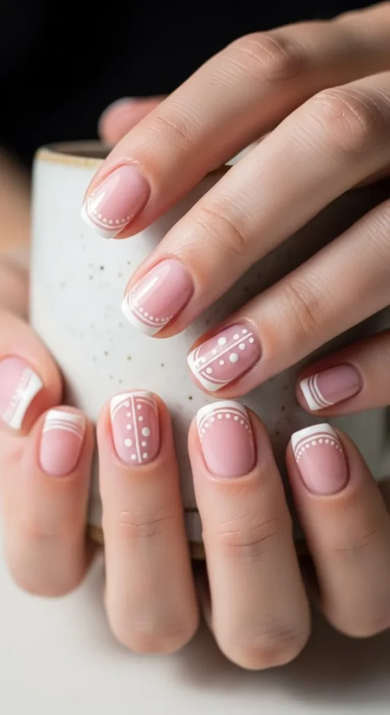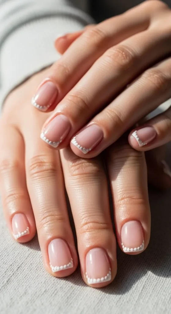 Small dots add charm to classic French nails. After applying the base and tips, place tiny dots along the line using a dotting tool or toothpick. White dots work best for a clean look. Short nails keep the design neat. This style is easy, affordable, and fun. It works well for everyday wear.