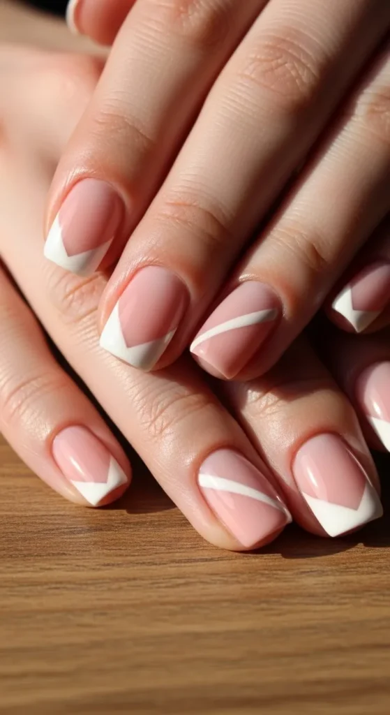 Diagonal tips change the usual straight line into an angled one. Paint the base, then create slanted tips using tape or guides. This makes nails appear slightly longer. Short nails look stylish with this design. You can keep all angles the same or alternate them. Finish with top coat. It’s simple, modern, and beginner-friendly.