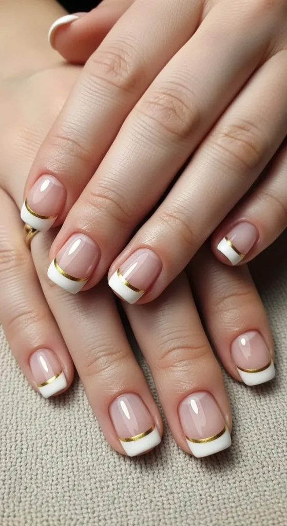 Adding a thin gold line to your French tips brings instant charm. Begin with a nude base and white tips. Then draw a fine gold stripe where the tip meets the base. A thin brush or nail tape helps with clean lines. Short nails keep this design delicate. It works well for parties and daily wear. You can also add gold to just one accent nail. Always seal with top coat to prevent fading. This design feels stylish without being loud and works with simple jewelry.