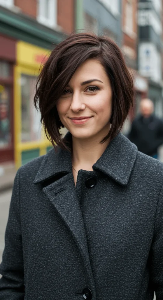 This angled bob is slightly longer in front and layered for fullness. Blow-dry the front downward with a round brush for shape. It’s a stunning winter cut that works even without heavy styling. Use volumizing mousse before drying to keep it bouncy.