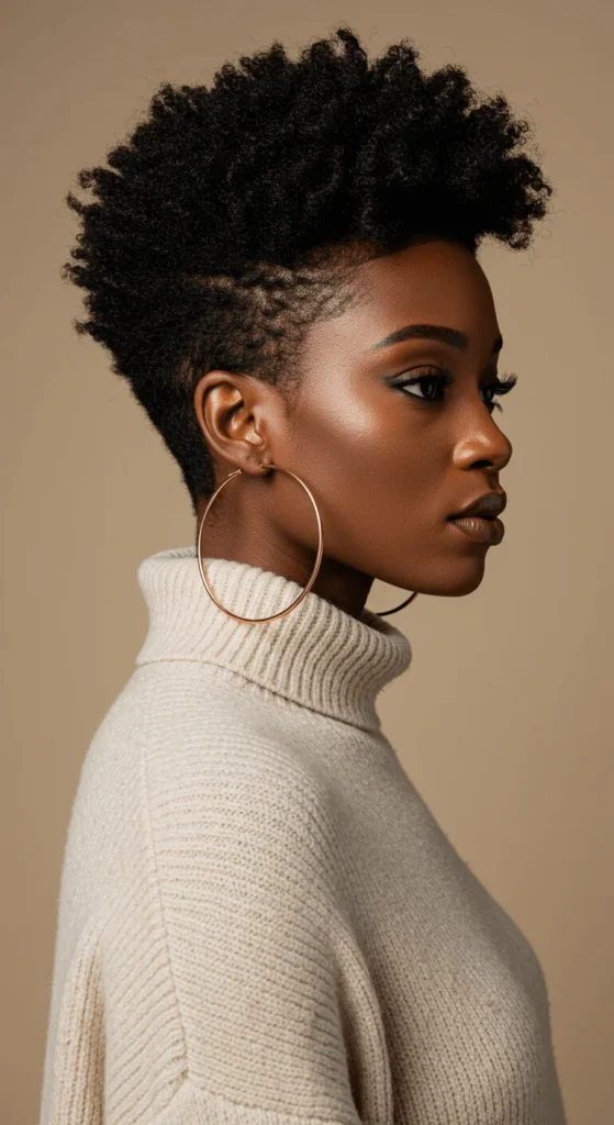 The short afro fade brings natural definition while keeping styling low. Moisturize daily with a shea-based cream to prevent dryness in cold weather. Add a fade pattern if you visit a barber, or shape it at home with a pick. It’s expressive and classy for winter.