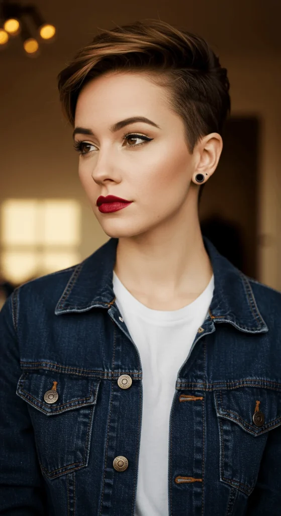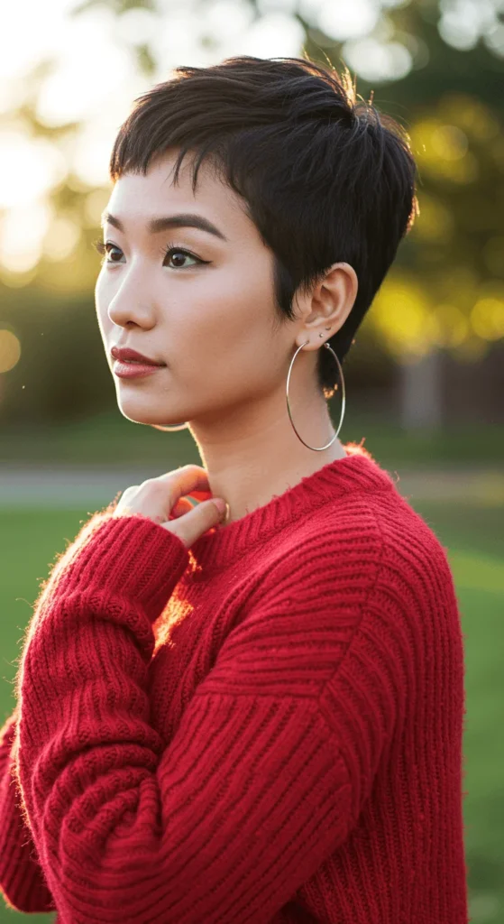 This cut works beautifully for natural curls. The curly pixie gives volume without heaviness. Apply curl cream and scrunch with your hands for bounce. You can shape it at home with small scissors, trimming curls around your ears. This cut frames your face softly, giving you warmth and personality in one.