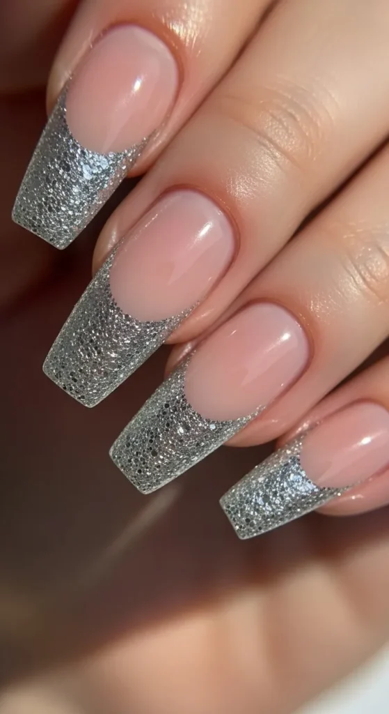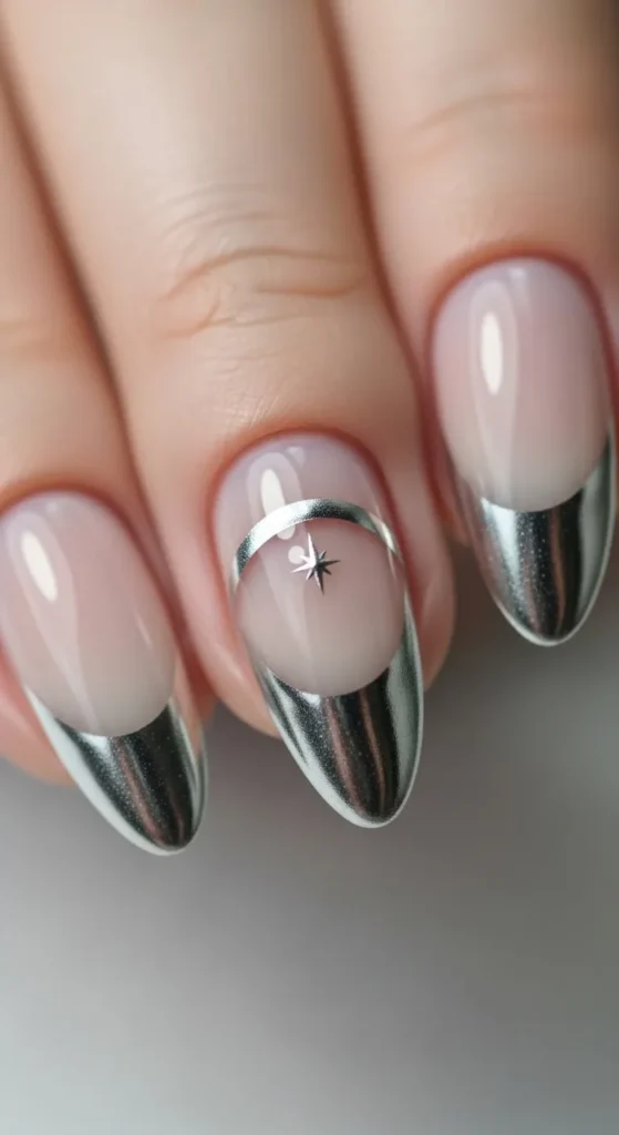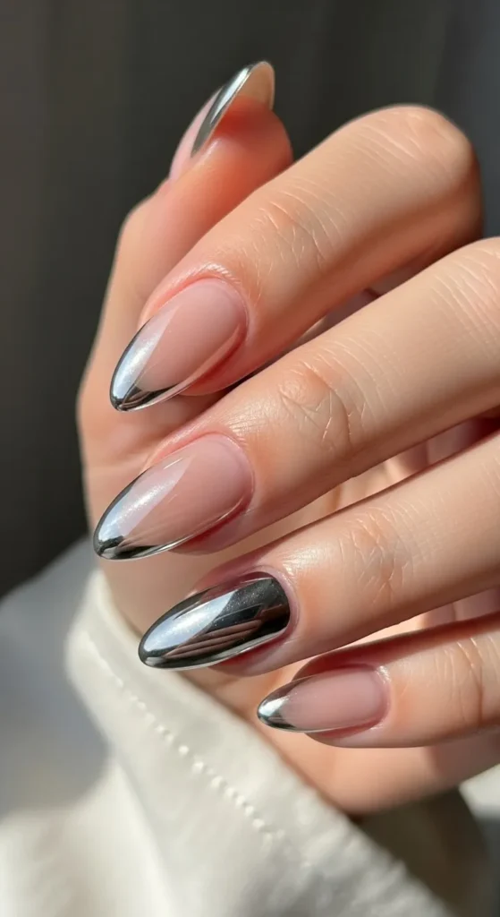 Instead of a sharp line, create a soft fade from nude to silver. Use a small makeup sponge and dab silver polish lightly at the tip. Blend upward gently and add thin layers until you like the intensity. Clean the edges and seal with a glossy top coat. This style feels soft yet current. It is perfect if you do not like harsh lines. Practice on one nail first to test the blending technique.