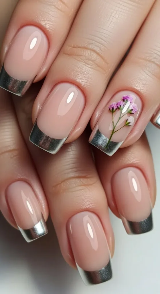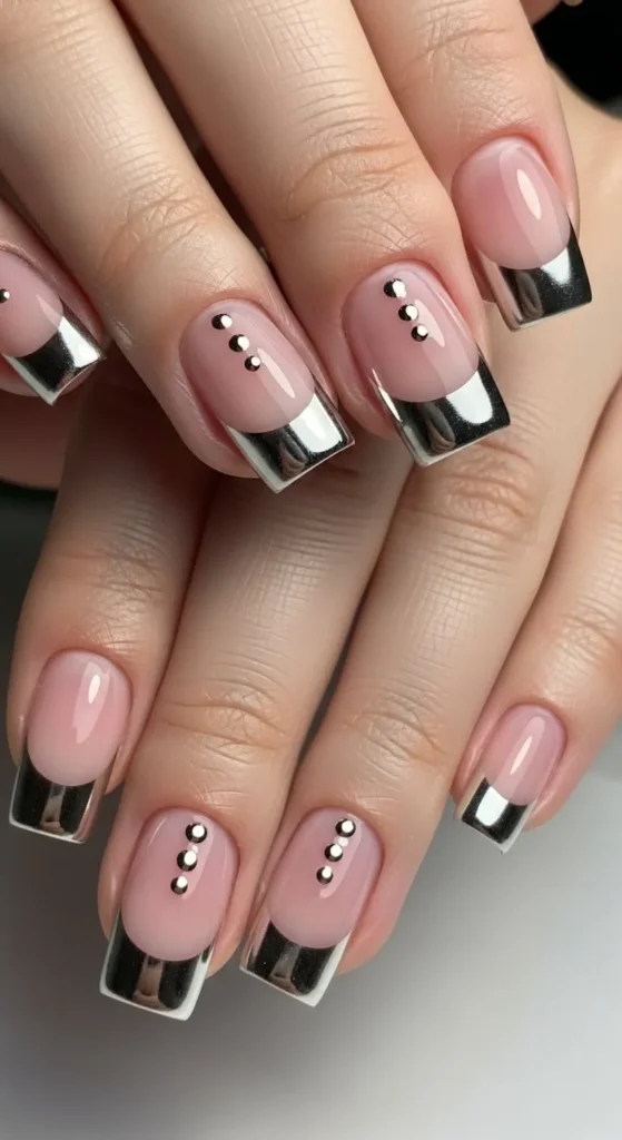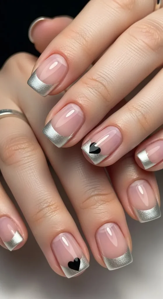 A soft pink base warms up cool silver tones. Choose a sheer blush shade and apply silver tips carefully for contrast. The mix feels flattering on many skin tones. You only need two polishes to recreate this look at home, which keeps it affordable.