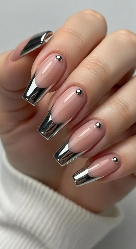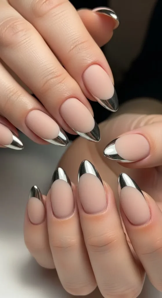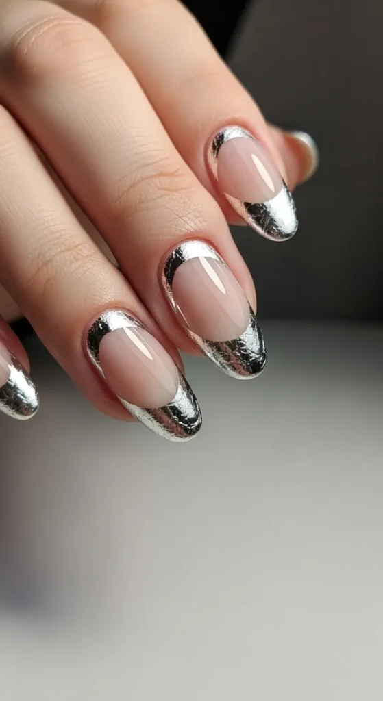 Silver foil gives a slightly textured and reflective finish. It feels edgy but still wearable. Apply nail foil glue just on the tips and press small pieces of silver foil onto the glue. Smooth it gently and seal with a clear top coat. Foil is affordable and lasts a long time because you only use tiny pieces. Keep the base color neutral so the foil stands out. If you want a softer look, use smaller foil fragments. This style is perfect if you like shine but want something less smooth than chrome.