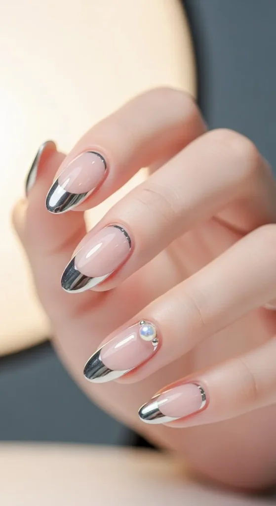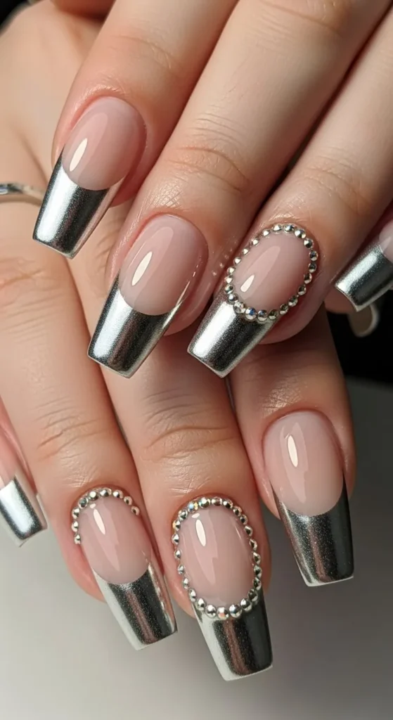 Add one small pearl near the cuticle on an accent nail while keeping the rest as simple silver tips. The mix of shine and soft pearl detail feels stylish and balanced. Pearls are affordable and easy to apply with nail glue. Do not overload every nail. Keep it minimal for a cleaner finish.