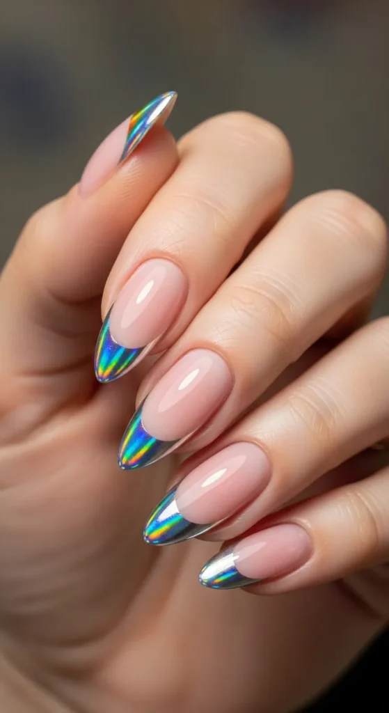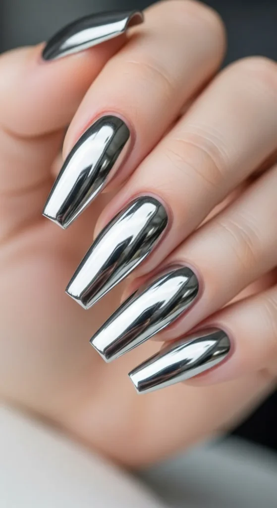 Use holographic silver polish for a subtle rainbow effect under light. The shine changes depending on where you stand. Apply two thin coats for smooth coverage. This look feels playful but still sleek enough for everyday wear.
