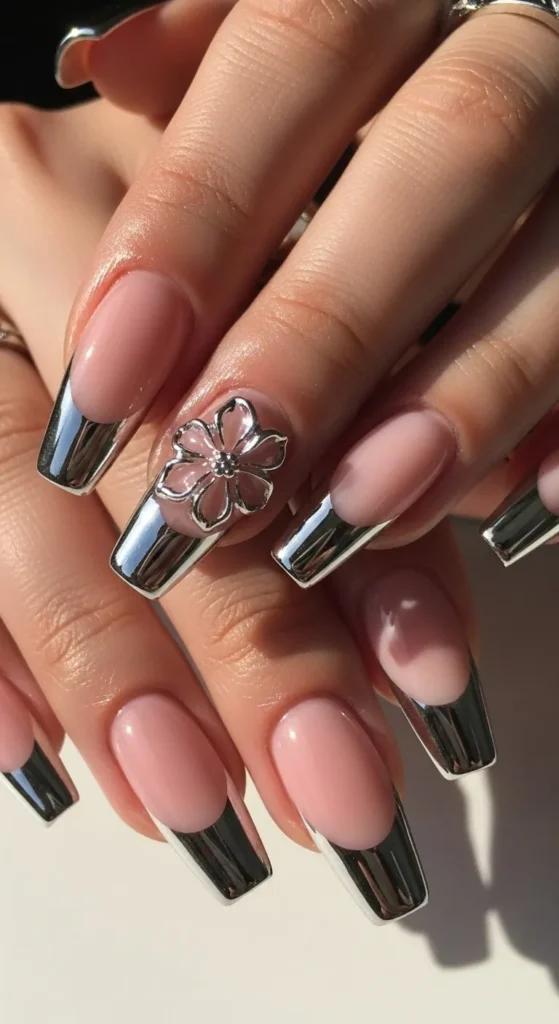 This look keeps the base soft and natural while the tips shine like a mirror. The chrome finish makes the silver stand out in a clean way. It feels modern but still timeless. You can get this style at home with silver chrome powder. Apply a nude or pale pink base and let it dry fully. Add a thin French tip using gel polish, then rub chrome powder on top and seal with a glossy top coat. If chrome powder feels expensive, try a metallic silver nail polish instead. Use French tip guides to keep the line neat. This design looks amazing on almond and oval shapes, but it also works on short nails. Pair it with simple silver rings for a coordinated look. Keep the base simple so the shine stays the focus.