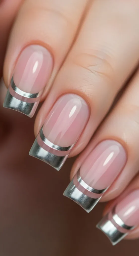 Instead of one line, add two. A double silver French tip feels creative and modern. Paint your regular thin silver line first and let it dry. Then add a second line slightly below it, leaving a tiny gap between them for a graphic look. This works best on longer nails so the design has space. Striping tape can help keep the lines straight. It costs almost nothing extra since you are using the same polish. The layered detail makes your manicure look different without adding gems or extra tools.