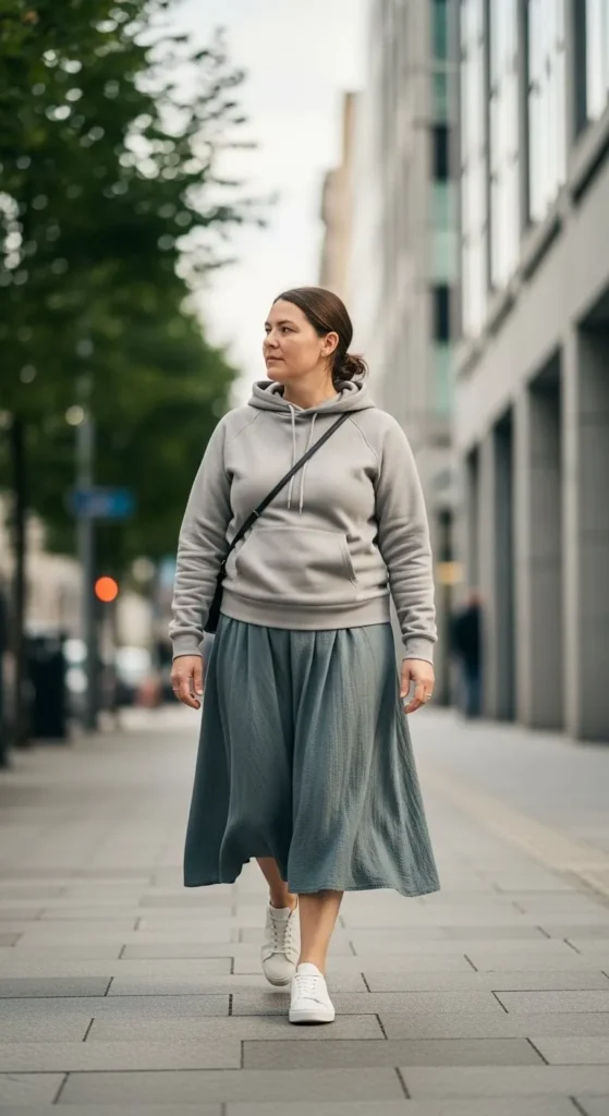 A hoodie with a skirt feels comfortable and modern. Choose a clean, plain hoodie and a simple skirt. Budget tip. Hoodies are easy to find at low cost. DIY tip. Crop the hoodie slightly. This outfit suits casual days.