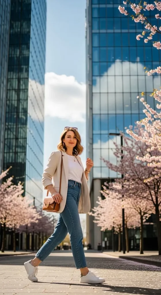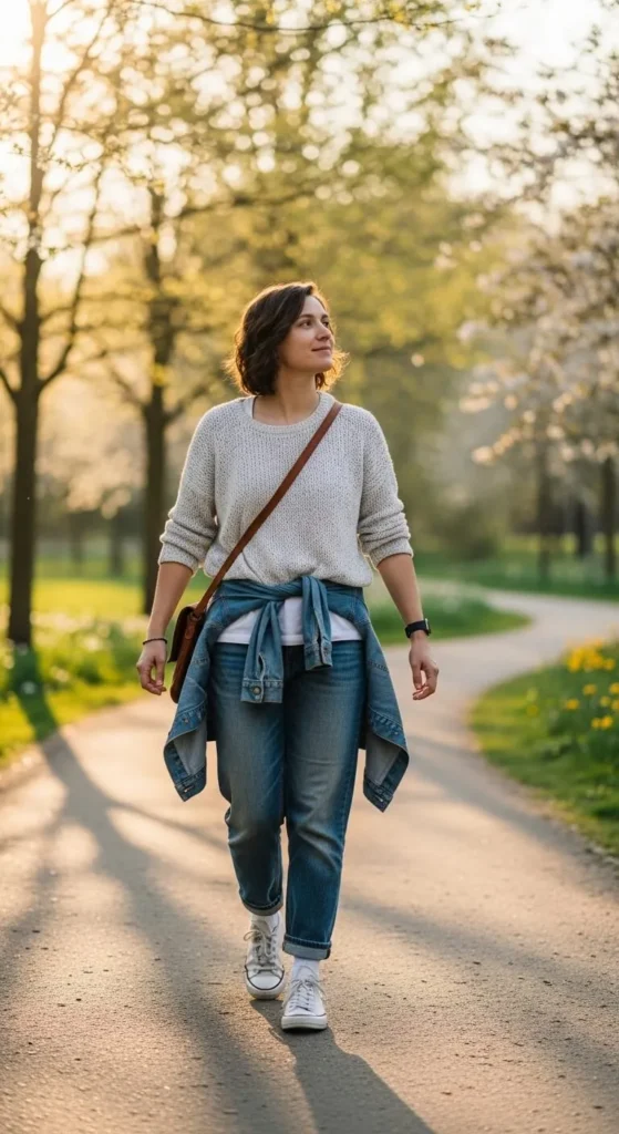 A white shirt and blue jeans always work, especially in spring. The key is the fit. Choose a slightly loose shirt instead of a tight one. Roll the sleeves once or twice and leave the top button open for comfort. Relaxed jeans feel current and are easy to wear all day. This outfit works with items you may already own. If your shirt feels plain, add a belt or a small shoulder bag. Flat sandals or clean sneakers keep it casual. For cooler mornings, drape a thin sweater over your shoulders. Budget tip. Check thrift stores for men’s white shirts. They often have better fabric and cost less. DIY tip. If the shirt feels too long, a simple front tuck changes the shape without tailoring. This look fits errands, casual lunches, and quick meetups.