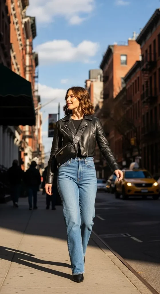 A cropped jacket balances high-waist jeans. Keep the top simple. Budget tip. Short jackets appear in thrift shops. DIY tip. Crop an old jacket carefully. This outfit feels current.