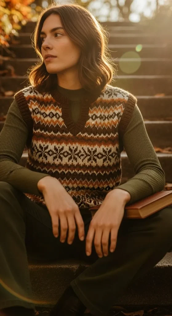 A knit vest adds warmth without bulk. Wear it over a basic top with jeans or trousers. Budget tip. Vests are often low cost. DIY tip. Cut sleeves from an old sweater.