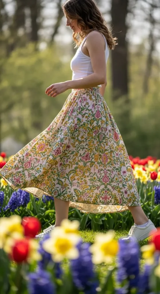 Let the skirt stand out and keep the top simple. Budget tip. Printed skirts are easy to rewear. DIY tip. Hem the skirt to your height. This outfit suits daytime plans.