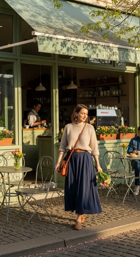 A light knit sweater with a midi skirt feels easy and balanced. Choose a thin sweater that does not feel heavy. A soft cotton or light ribbed fabric works well. The skirt can be pleated or straight. This outfit works for days when weather changes. Tuck the front of the sweater slightly to shape the waist. Keep the rest loose. Budget tip. Look for last season skirts on sale. Solid colors are easier to rewear. DIY tip. If the sweater feels boxy, add a slim belt over it. Flat shoes or low heels both work. This look suits casual offices and daytime plans.