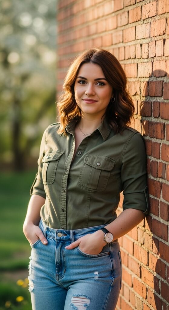 Utility shirts feel practical and easy. Wear one with basic jeans and simple shoes. Leave it untucked or half tucked. Budget tip. Utility shirts often go on sale. DIY tip. Roll sleeves and stitch them if they slip. This outfit works for errands.