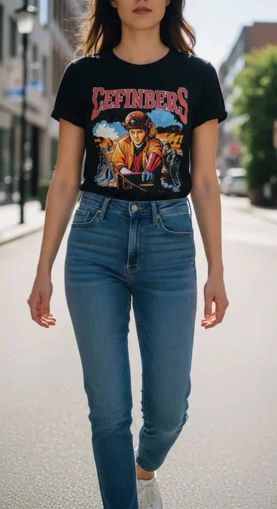 A graphic tee works when styled simply. Pair with clean jeans and minimal accessories. Budget tip. Old tees still work. DIY tip. Tuck or knot the tee.