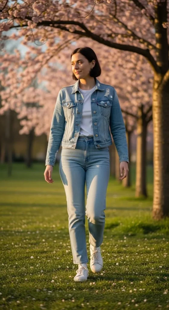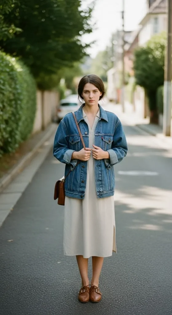 A denim jacket is perfect for spring. Wear it over a simple dress for an easy outfit. The dress can be plain, ribbed, or lightly patterned. Keep the shape relaxed. The jacket adds structure and makes dresses feel more casual. Leave it open or button one button at the waist. Budget tip. Thrift stores often have great denim jackets. DIY tip. Roll the sleeves and pin them inside for a clean look. This outfit works for walks, casual plans, or travel days.