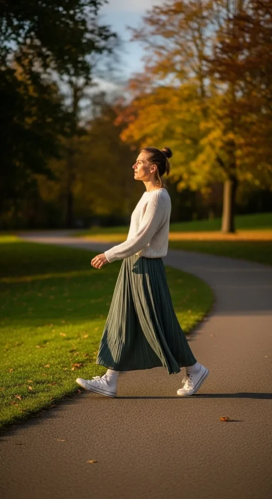 Sneakers make skirts easy to wear. Choose clean styles and simple tops. Budget tip. White sneakers go with many outfits. DIY tip. Clean shoes often.