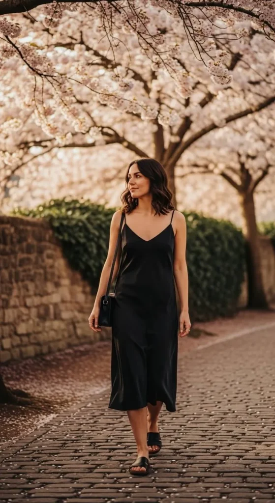 A slip skirt feels light for spring. Pair with a knit top for balance. Budget tip. Slip skirts repeat well. DIY tip. Shorten straps if needed. This outfit suits many plans.