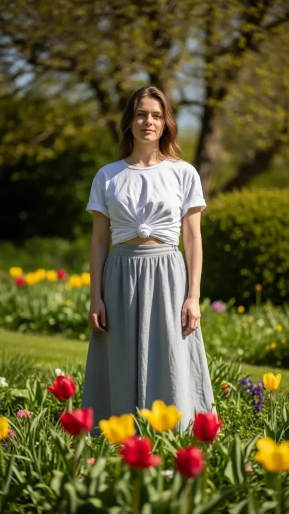 Tie a knotted tee at your waist to pair with a linen skirt. It gives shape without complicated tailoring. Pair with sandals or mules. Choose neutral shades for versatility. DIY t-shirt knots are easy and low-cost. Add a small tote bag or layered bracelets for interest. Even simple alterations on a skirt hem can update older pieces affordably.
