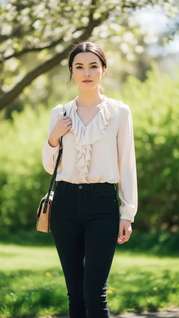 A ruffled blouse with skinny pants balances femininity and practicality. Light, breathable fabrics make it easy to wear all day. Pair with flats or low heels. Budget-friendly stores often carry ruffled blouses in subtle colors. Roll sleeves or tuck partially to personalize the look. Add minimal jewelry or a small crossbody bag. DIY alterations can adjust ruffle placement or sleeve length.