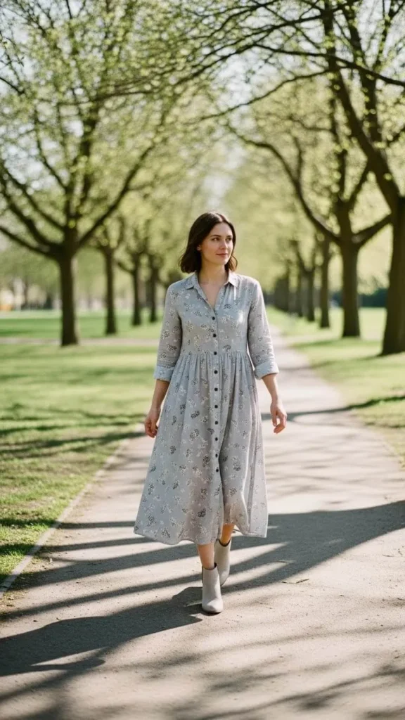 A button-up dress with ankle boots gives a casual, slightly edgy vibe. Lightweight cotton or linen works best for spring. Roll sleeves and pair with a thin belt if desired. Mix high-street boots with thrifted dresses for budget-friendly style. Add a tote bag or simple scarf for flair. Minimal DIY stitching or buttons can customize the dress affordably.