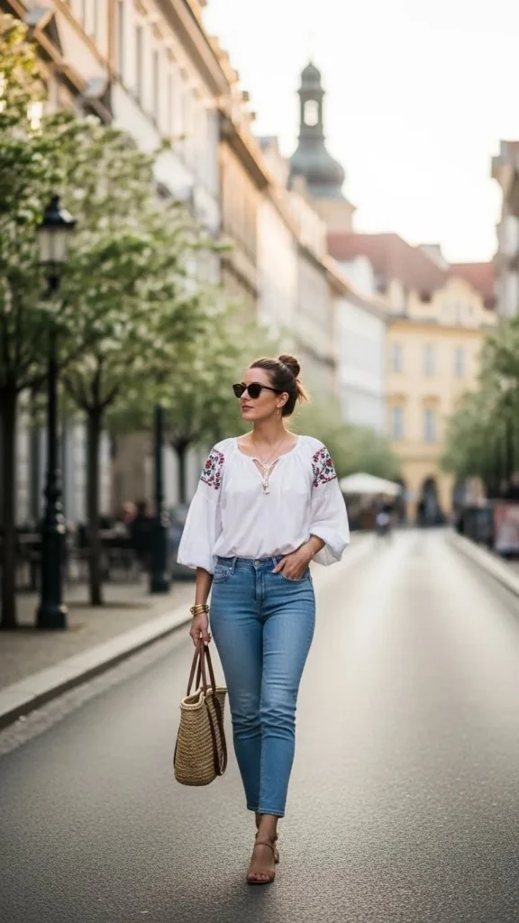 A peasant top with slim jeans balances loose and fitted silhouettes. Pair with sandals or flats for comfort. Light fabrics make it easy to wear in spring weather. Affordable peasant tops can be found in thrift shops. Add a subtle necklace or belt for detail. DIY embroidery or fringe can make older tops feel new. Layer with a light jacket if needed.