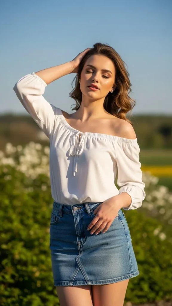 An off-shoulder blouse with a denim skirt is playful and light. Pair with sneakers or strappy sandals. Light fabrics keep it comfortable. Budget-friendly skirts can be altered for new fits. Add small hoops or a thin chain to complete the look. DIY off-shoulder adjustments on tops make this outfit easy to create with older pieces. A small tote bag finishes the spring-ready style.