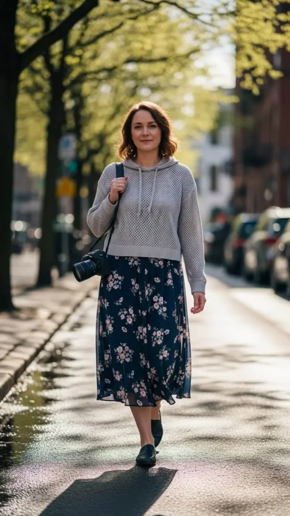 A lightweight hoodie with a midi skirt creates a casual yet put-together vibe. Pair sneakers for ease or flats for a slightly dressier look. Affordable hoodies work well with thrifted skirts. Tuck the front slightly or knot it to shape the waist. Add a subtle necklace or crossbody bag. DIY patches or embroidery on the hoodie add character. Rolling skirt hem or sleeves gives casual charm.