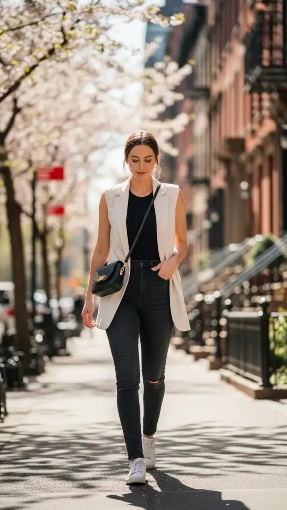 A sleeveless blazer layered over a tank with jeans is modern and light. Pair with loafers or sneakers. Lightweight blazers are easy to layer for spring. Budget-friendly options include thrift finds or DIY hemming for custom length. Accessories like simple chains or a belt bag finish the outfit. Rolling sleeves or adjusting tank straps personalizes the look effortlessly.