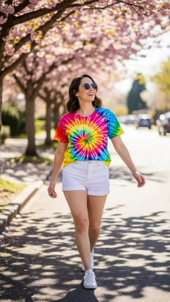 A tie-dye tee with white shorts is cheerful and simple. Pair with sneakers or slides. DIY tie-dye kits let you create budget-friendly, unique pieces. Minimal jewelry keeps the focus on colors. Rolling shorts hem adds casual flair. Add a small crossbody bag or straw hat to complete the spring-ready outfit. Even thrifted white shorts can be revitalized with minor DIY details.