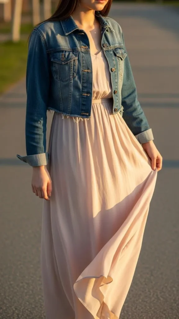 A cropped denim jacket over a maxi dress balances structure and flow. Choose soft cotton or linen dresses for comfort. Pair with flats or casual sneakers. Affordable denim jackets are easy to layer. Accessories like layered necklaces or a belt enhance the outfit. DIY distressing or patches on jackets adds personality. Rolling jacket sleeves and tucking dress slightly gives casual charm.
