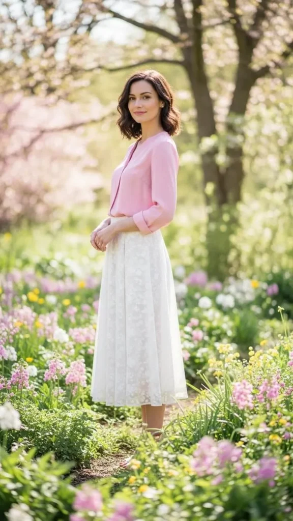Pair a pastel blouse with a midi skirt for a soft, feminine vibe. Tuck in the blouse to define your waist. Flat sandals or block heels complete the outfit. Mix textures like cotton with linen for effortless style. Thrift stores often have affordable skirts that work well. Add minimal jewelry like small hoops or a thin chain to keep the look polished without going overboard.