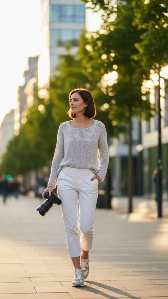 A light sweater and cropped trousers combination balances comfort and style. Choose neutral tones like beige or light gray. Sneakers or loafers keep the look casual. For budget-friendly options, mix high-street trousers with a DIY-dyed sweater. Roll up sleeves slightly for a relaxed feel. Layer with a thin trench coat if needed. Accessories like a small crossbody bag can finish the outfit neatly.