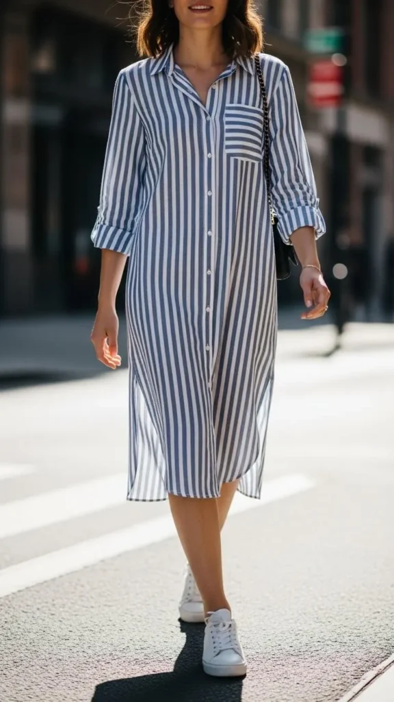 A striped shirt dress is easy to wear. Pair it with white sneakers for effortless charm. Roll the sleeves for casual appeal. Use a belt to add shape if needed. Lightweight tote bags complement the outfit without cluttering it. This look is budget-friendly since shirt dresses are often versatile pieces you can wear year after year. Simple DIY alterations can adjust the length or fit.