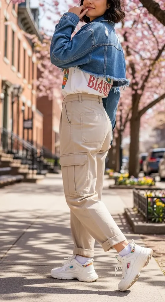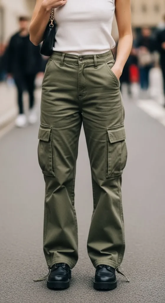 Cargo pants feel more relaxed this season. Softer fabrics and cleaner cuts make them easy to wear daily. Pair with fitted tees or tanks to balance volume. Thrifted pairs often work well. Neutral shades like olive or beige keep outfits simple. Flat shoes complete the look.