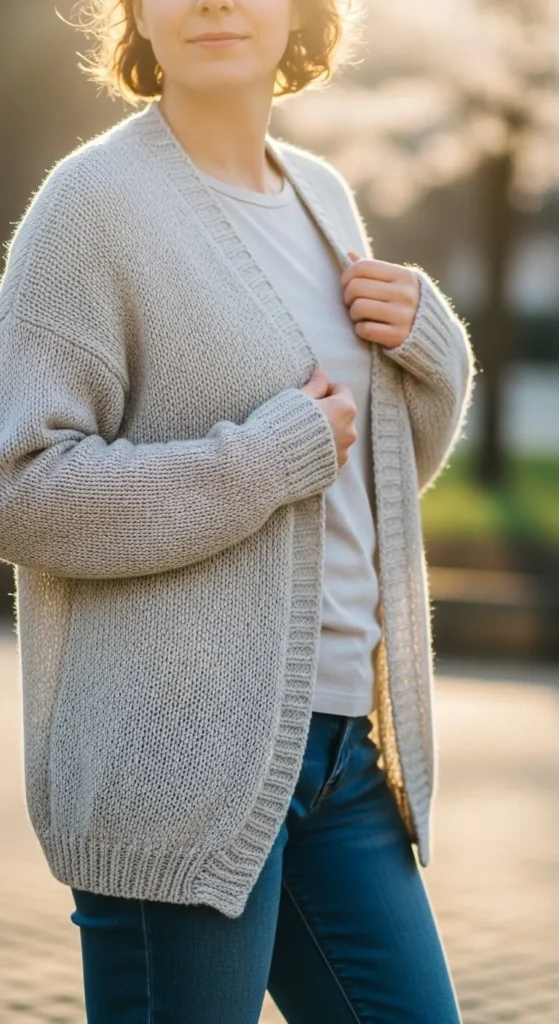 Light cardigans work as indoor and outdoor layers. Choose cropped or hip-length styles. Wear buttoned up as a top or open over tanks. Budget brands offer affordable cotton knits. Neutral colors stretch wear across many outfits. This piece works from morning to evening.