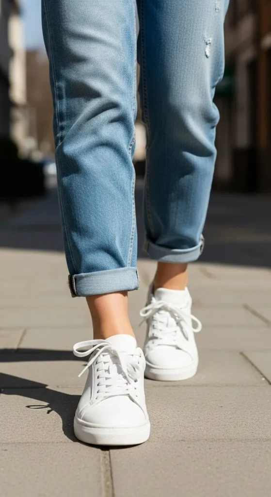 White sneakers remain popular for daily wear. They pair with dresses, jeans, and skirts. Look for easy-to-clean materials. Budget options work just as well as designer pairs. Keep them clean for a sharp look. This shoe style suits long walking days.