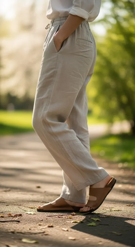 Linen pants feel light and breathable. Pair with tanks, tees, or button-downs. Wrinkles add character. Budget linen blends work well. Neutral shades stretch outfit options. These pants suit warm afternoons.