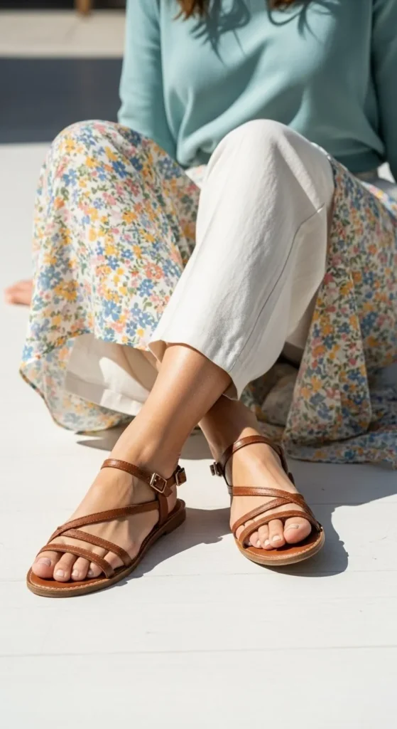 Flat sandals replace heavy shoes as temperatures rise. Simple designs feel practical. Neutral colors stretch wear. Budget options work well for daily use. Pair with jeans, skirts, or dresses.