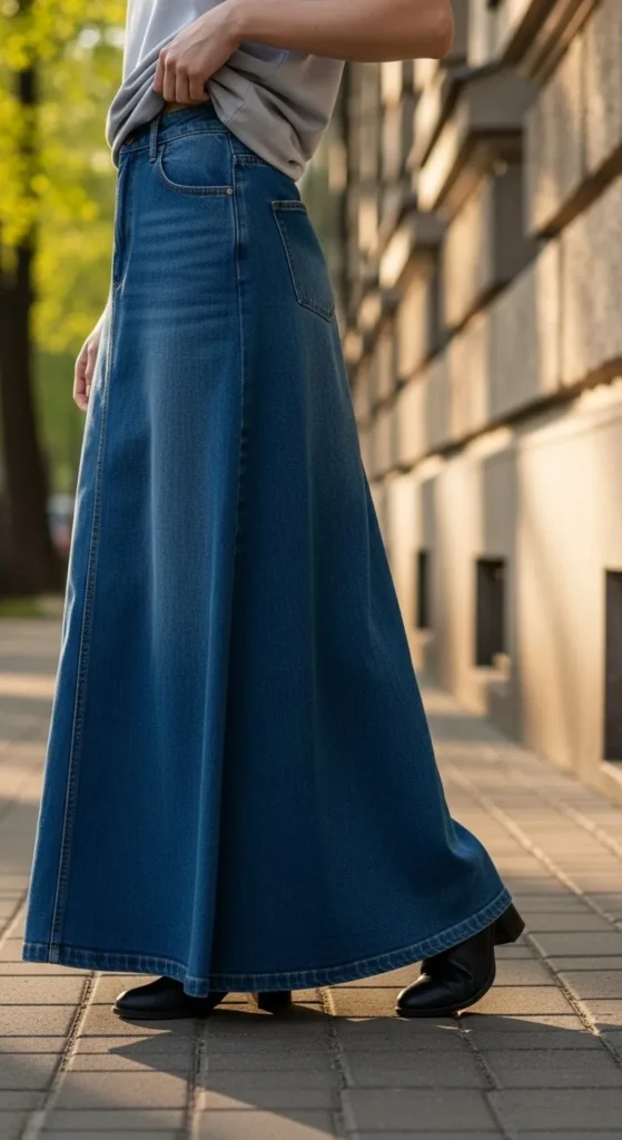 Denim skirts go longer this spring. Maxi lengths feel relaxed and easy to move in. Style with fitted tops or oversized shirts. Add sneakers for casual wear or sandals for warm days. Thrift stores often carry long denim skirts at low prices. You can cut a small front slit for comfort if needed.
