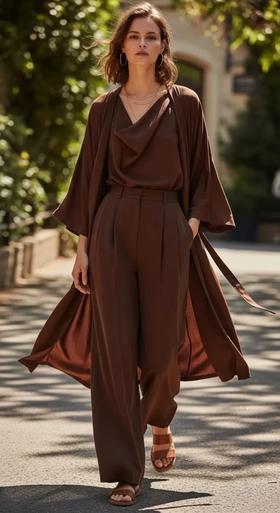 Brown works in warmer months when fabrics stay light. A brown tee with tailored pants creates an easy base. Many brands discount brown basics, making this look affordable. Keep styling simple and avoid heavy layers to maintain a spring feel.