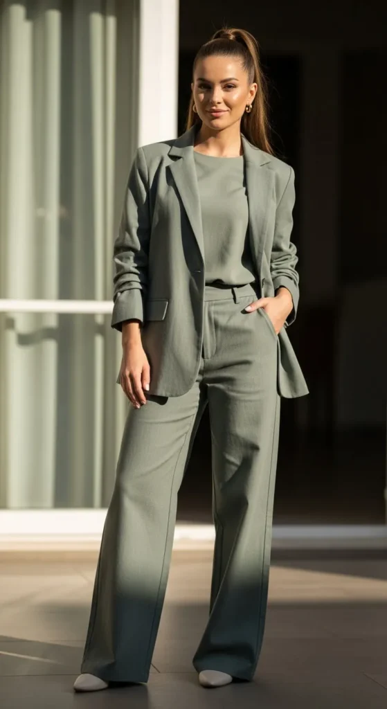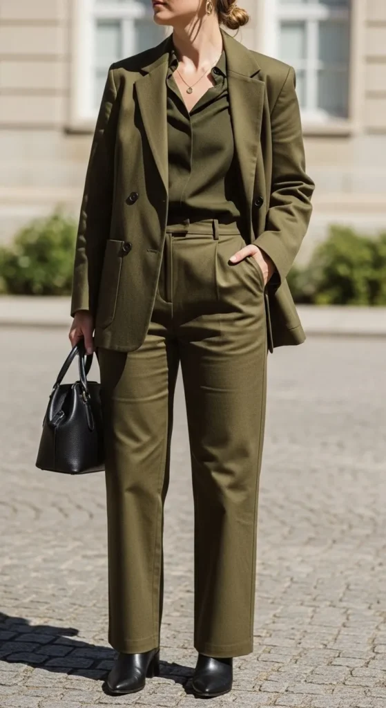 Olive green feels grounded and easy to wear. A matching top and pants keep things simple. Thrift stores often carry olive pieces, making this look budget-friendly. Focus on fit and tone matching. Neutral shoes complete the outfit.