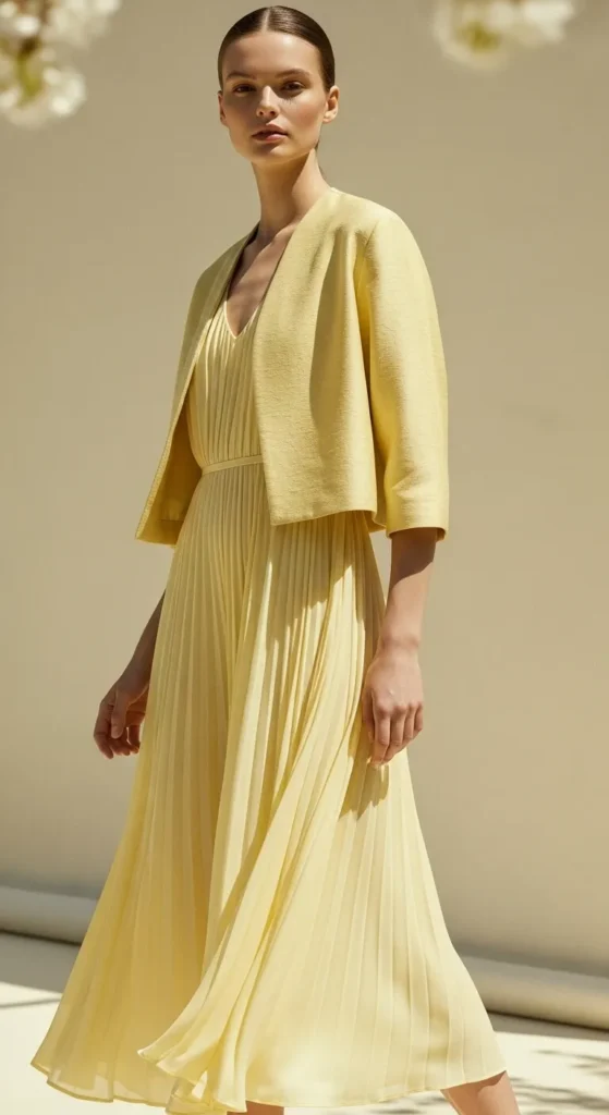 Soft yellow feels cheerful without being loud. Pale shades work best for monochrome outfits. Pair a light yellow top with matching bottoms. Matte fabrics help the outfit feel calm. Neutral shoes keep things balanced.